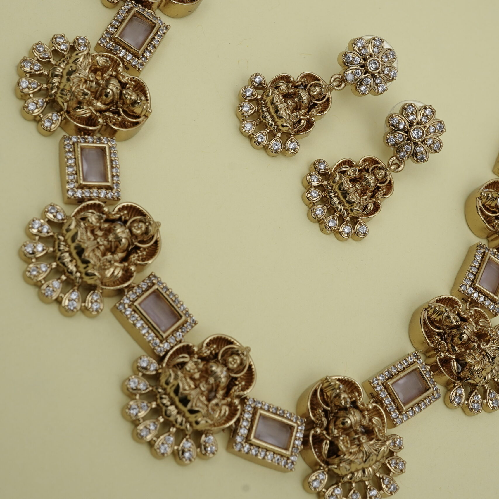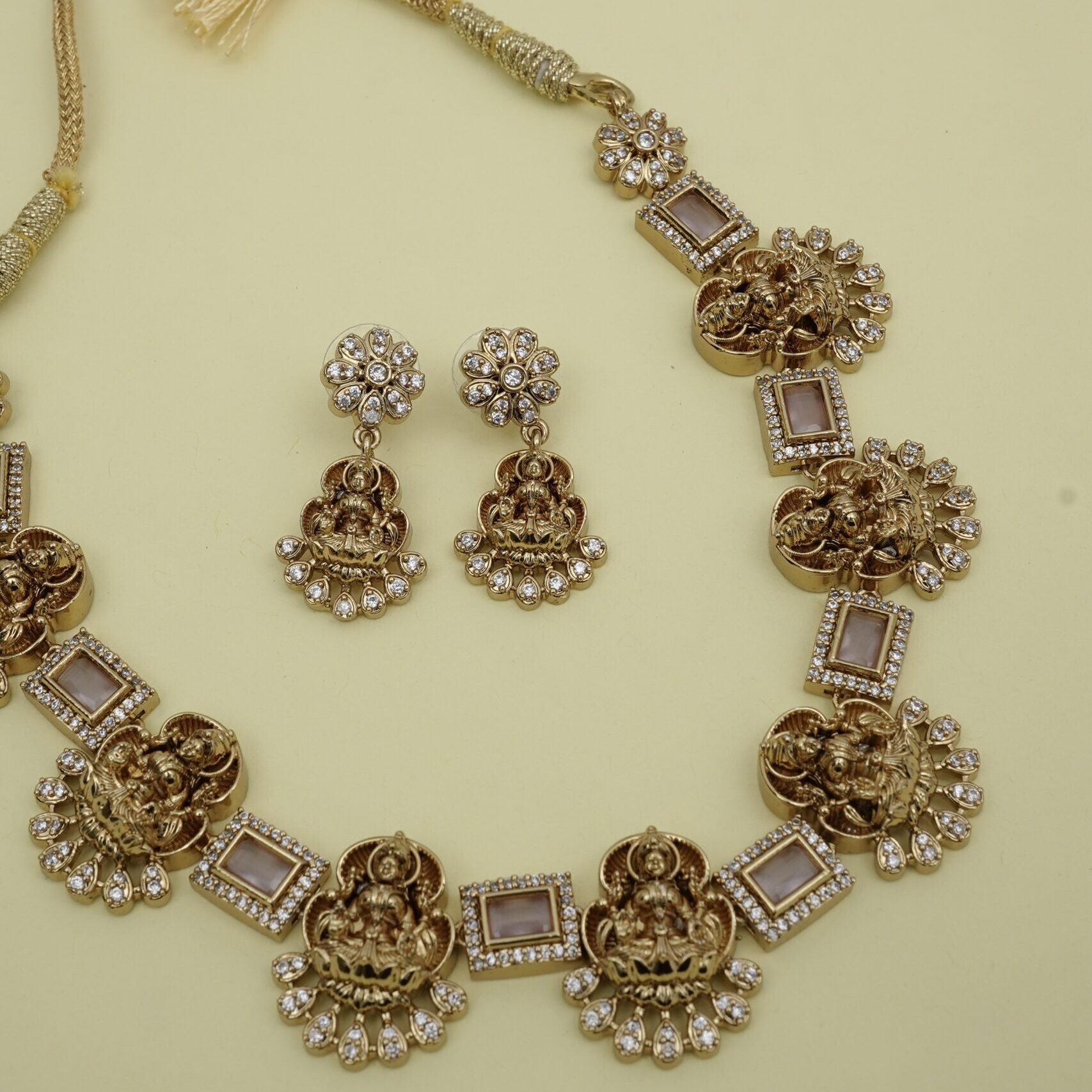 An antique gold-tone choker necklace set featuring alternating rectangular rose quartz-colored stones surrounded by white CZ, and circular motifs with embossed Lakshmi/goddess designs, further surrounded by white CZ floral patterns. The choker is completed with a tie-back adjustable cord. Matching drop earrings feature a floral CZ stud, suspending a Lakshmi motif, and a single dangling rose quartz-colored stone surrounded by white CZ.