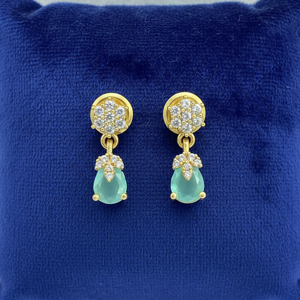 Gold-plated drop earrings featuring a teardrop-shaped light green stone, suspended from a fan-shaped cluster of white CZ stones, which is attached to a floral stud of white CZ stones.