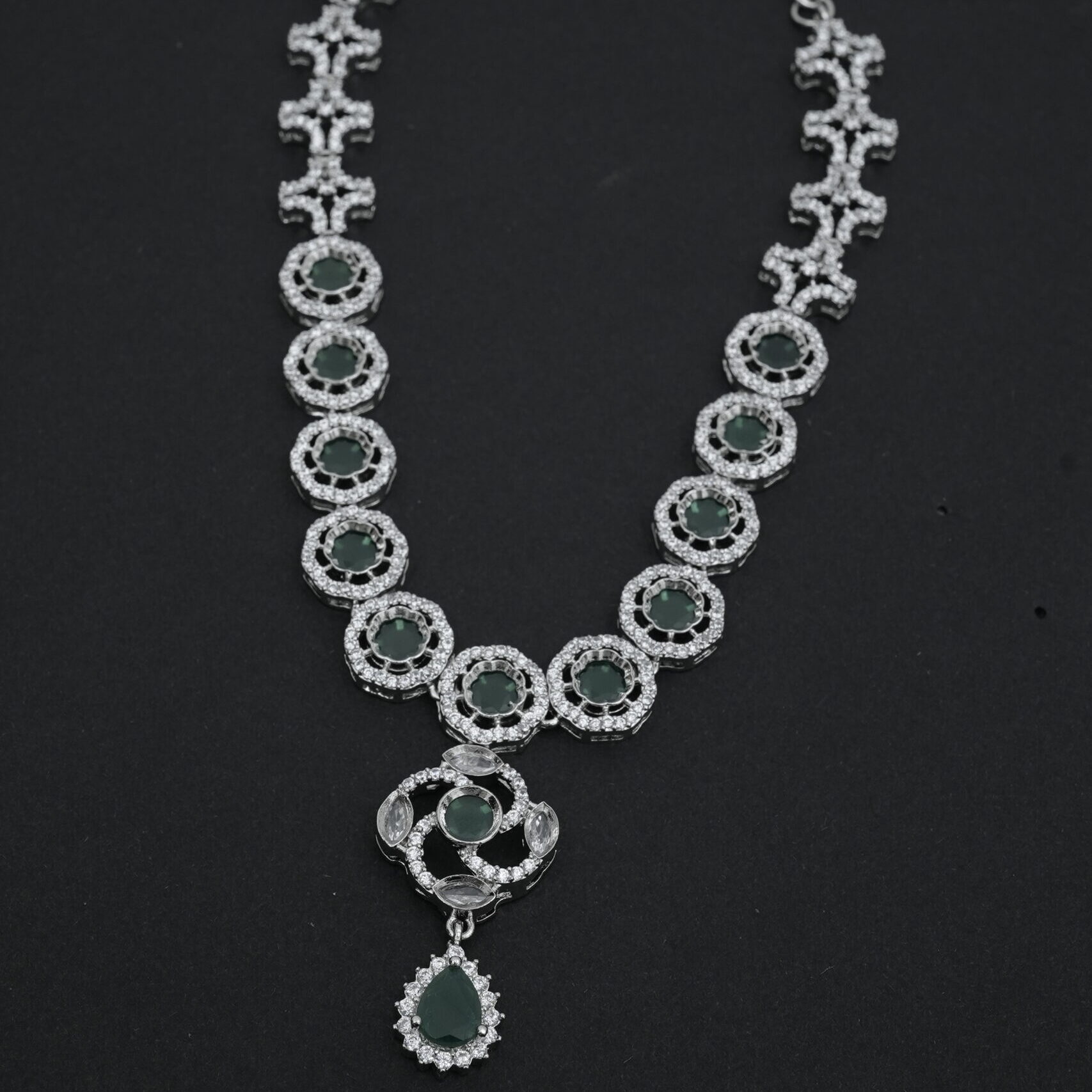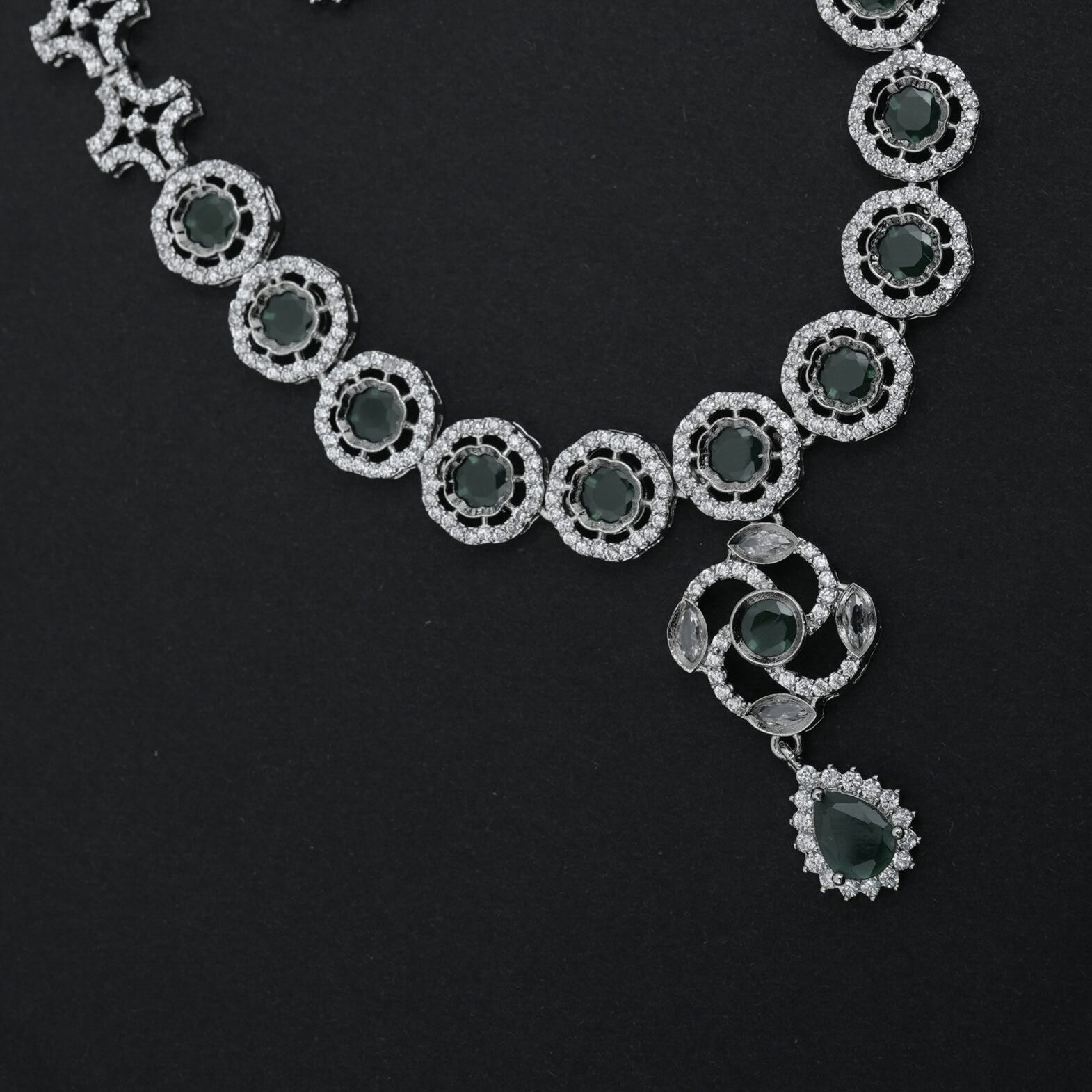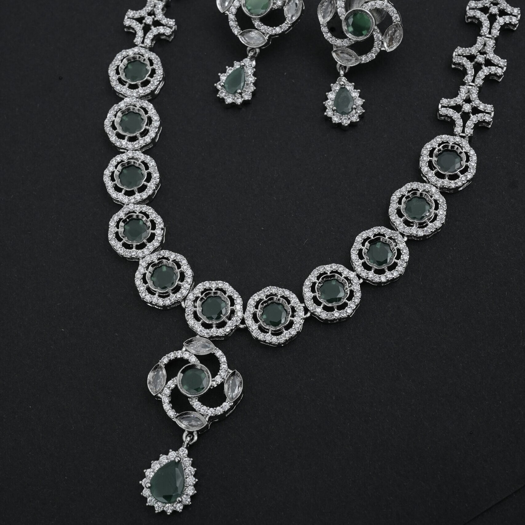 A rhodium-tone necklace set featuring a series of round green stones, each encircled by white CZ stones. The necklace has a central pendant with a swirling CZ design and a dangling teardrop-shaped green stone surrounded by white CZ. Matching drop earrings feature a top swirl CZ design with a central green stone, and a dangling teardrop-shaped green stone surrounded by white CZ.