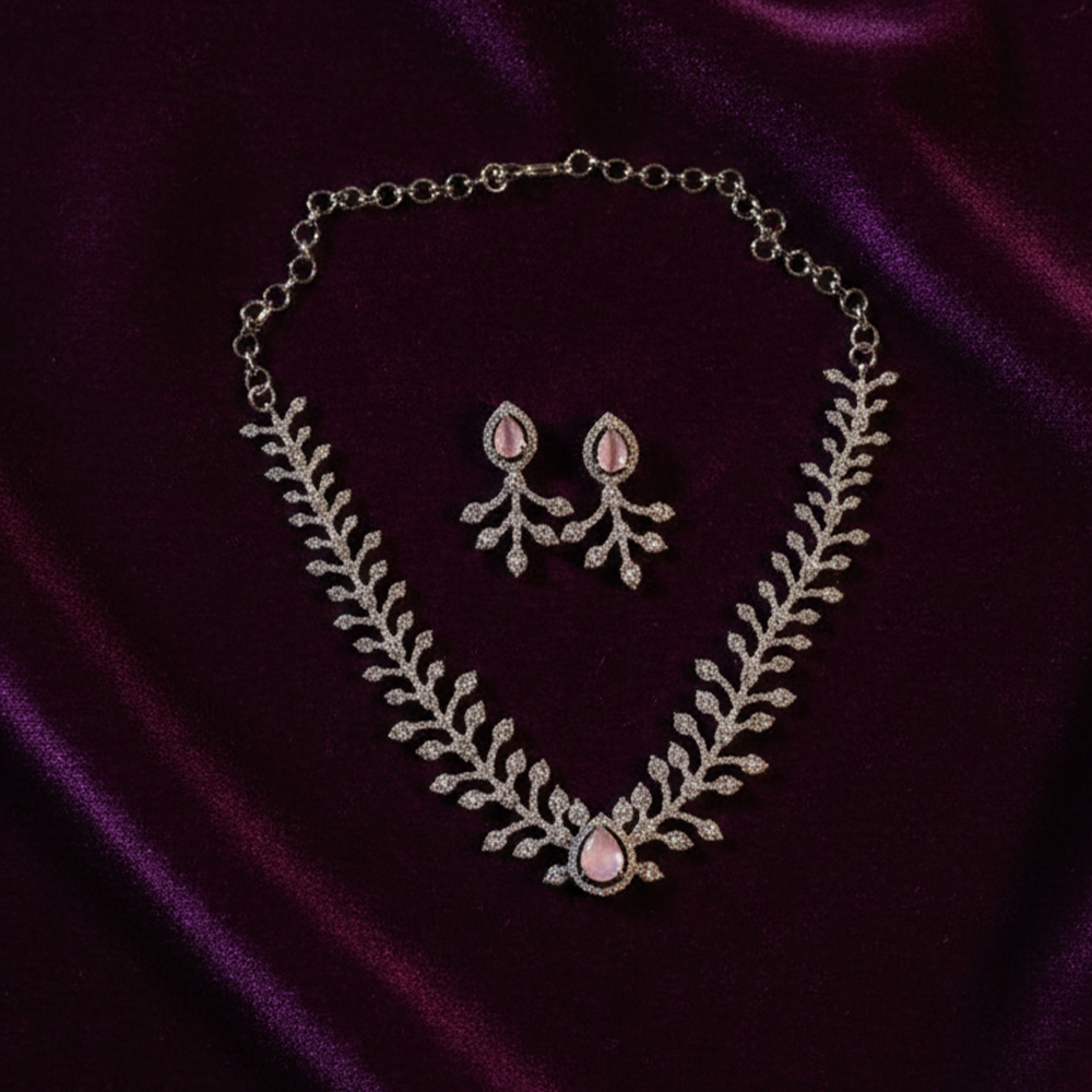 Silver-Tone necklace set featuring a central pink teardrop stone surrounded by white CZ stones, with a wide collar design of intricate leaf-like motifs adorned with white CZ stones. Matching stud earrings with pink oval stones and CZ leaves.