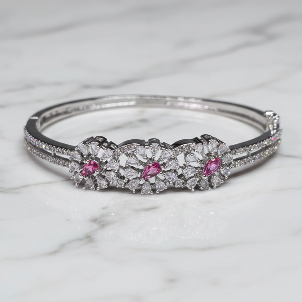 Silver-plated openable bracelet featuring three floral clusters with central pink marquise-cut stones surrounded by white CZ stones. The bands are also adorned with small white CZ stones.